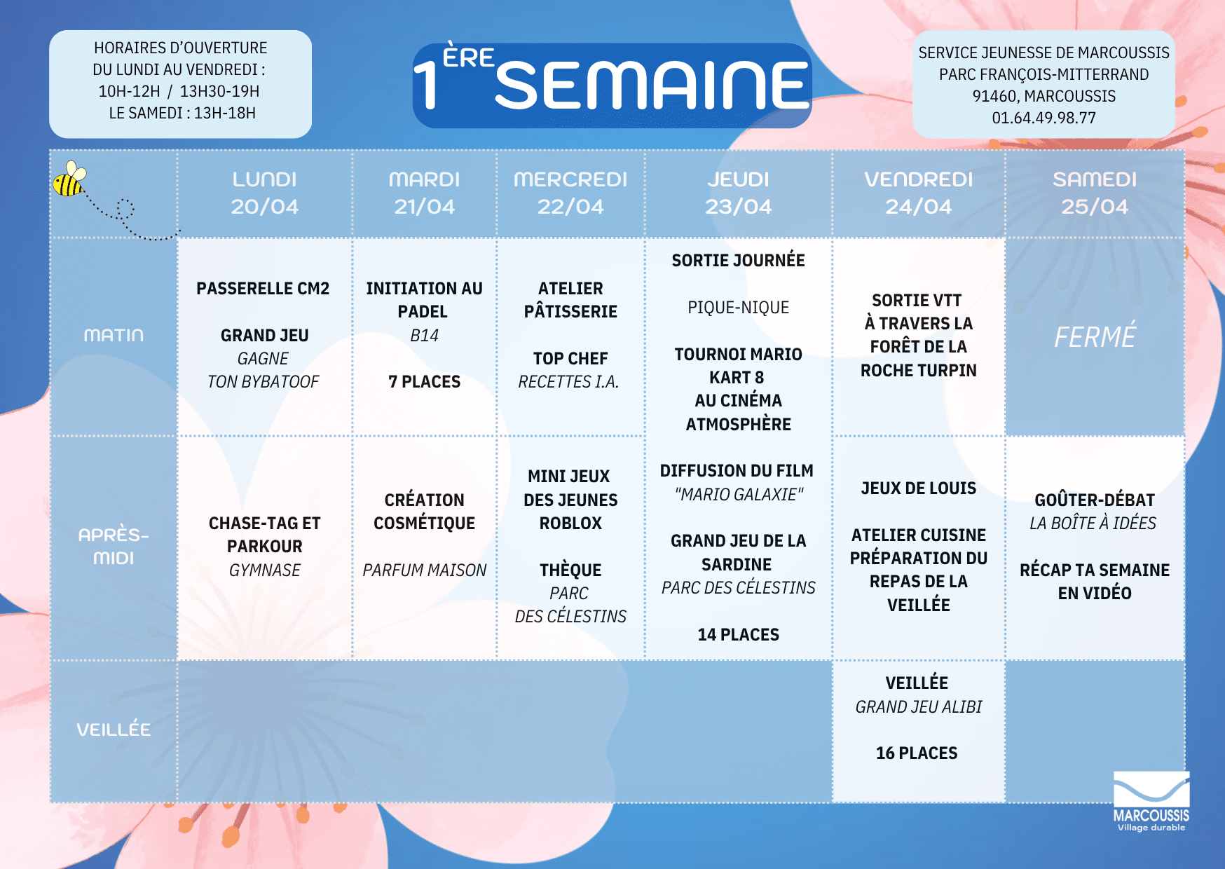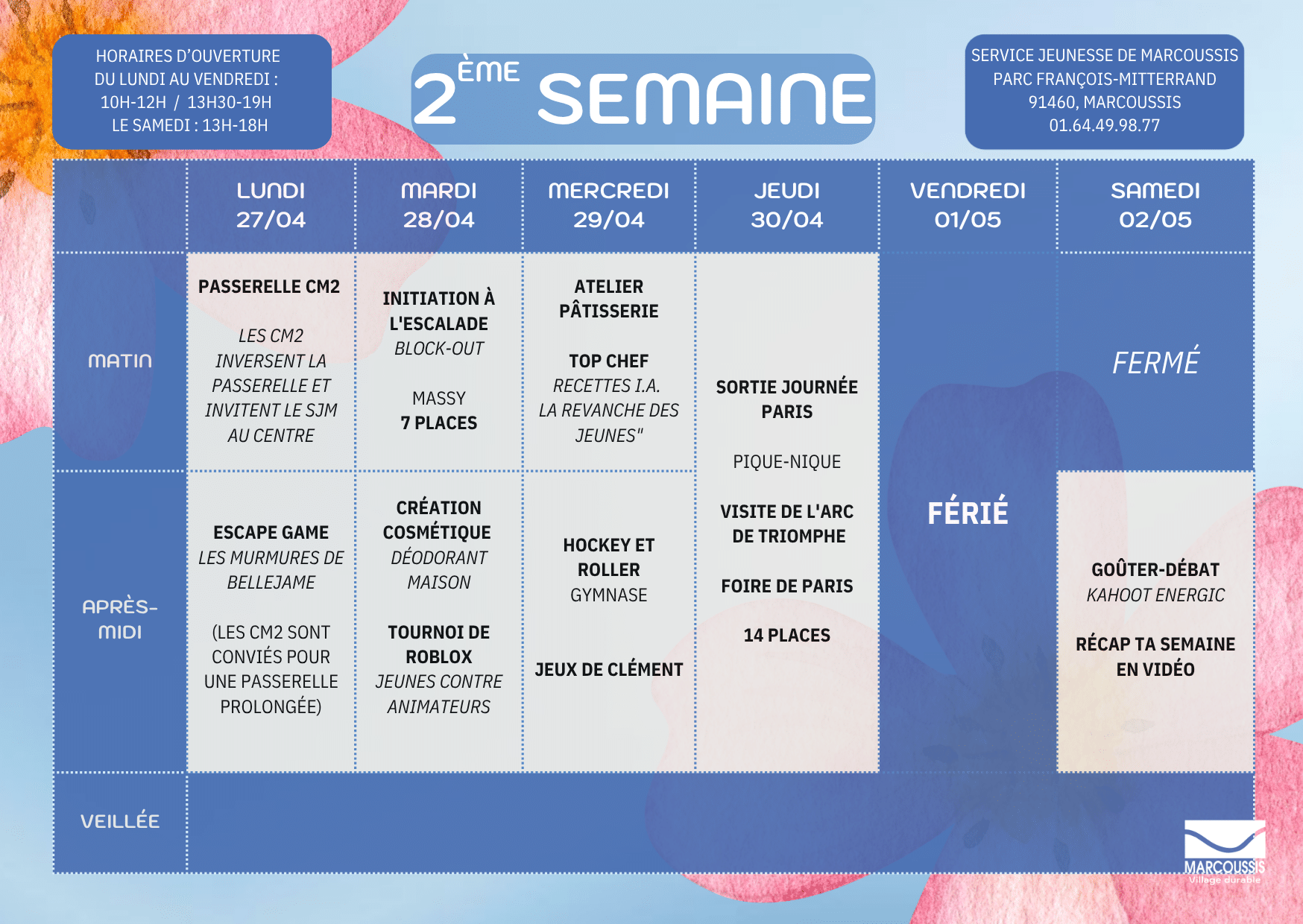 Des activités sur site et hors les murs, des sorties (demi-journées ou journées) et des veillées pendant les vacances scolaires. Par exemple : des tournois sportifs, de jeux vidéo, de jeux de société, des activités manuelles, du bricolage, des ateliers cuisine et des goûters débats, des sorties au musées, des veillées grand jeu ou cinéma.